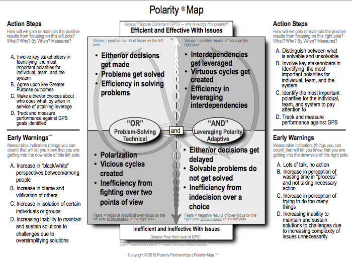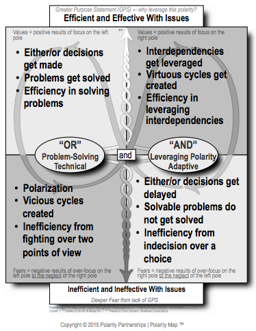 Starting in 1975, Dr. Barry Johnson identified the need to supplement problem solving thinking (using “either/or”) with polarity thinking (using “both/and”). The evolution of his key principles and Polarity MapÔ has resulted in a powerful approach to accelerate collective engagement and learning. Performance is measured in real-time for multiple polarities, for multiple purposes, and at multiple system levels simultaneously (organization, team, and individual levels). The inherent tension is used as a resource to create sustainable competitive advantage referred to as “leveraging,” which is superior to false-choice trade-offs and even to “balancing,” which is considered a sub-optimal goal or measurement outcome.