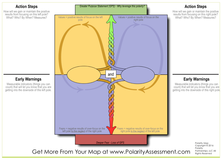 The term polarity refers to a specific category of paradox that involves a predictable dynamic at play in an unsolvable interdependent pair. When groups experience a paradoxical situation but lack a cogent way to make sense of it, not only do results suffer, but also the group’s morale, communication, and relationships are also negatively impacted (Emerson, 2013). Polarity Maps™ enable groups to navigate paradox/polarity instead of suffering through it blindly. According to Emerson (2013), Polarity Maps™ embody the key elements of an effective sense-making tool and can serve as a bridge between theory and practice. As such, Polarity Maps™ enable groups to harness the tension inherent in paradox and “navigate” it in a way that positively impacts their results while simultaneously increasing morale, enhancing communication, and strengthening their relationships. Polarity Maps™ are a practical way for groups to “make object” (Kegan, 1994) the paradoxes/polarities they experience and thereby alleviate the detrimental impacts often associated with the phenomenon (Pepper & Larson, 2006). The Polarity Map™/PACT™ is a “wisdom organizer” that leaders, teams, and organizations can use to navigate unsolvable but leverage-able polarity tensions.
