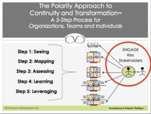 The 5-Step PACT (Polarity Approach to Continuity and Transformation) process includes Engage Key Stakeholders as part of each step in the process.