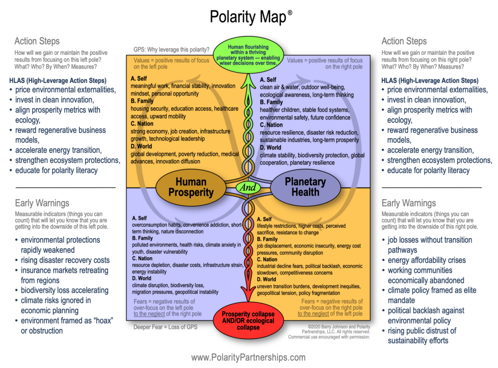 Underneath the political noise sits a polarity most societies have never learned to name: Human Prosperity And Planetary Health. Prosperity matters. Innovation matters. Economic vitality matters. Families want stability, opportunity, and a future that improves on the past. That desire is neither selfish nor controversial. It is simply human. But Prosperity to the neglect of Planetary Health produces consequences that eventually circle back to the very prosperity we were trying to protect over time.