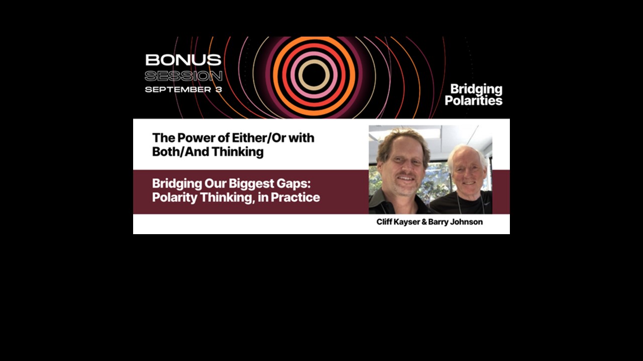 Since 1975, Barry Johnson has been pioneering the theory and practice of polarities—interdependent pairs that require thinking/acting in “Both/And” to be effective in inner and outer development, over time. His recent book, “And: How to Leverage Polarity, Paradox, and Dilemma, Volume 1 – Foundations”, offers a transformative lens for understanding how polarities operate in human systems—and how to harness their power in practice.