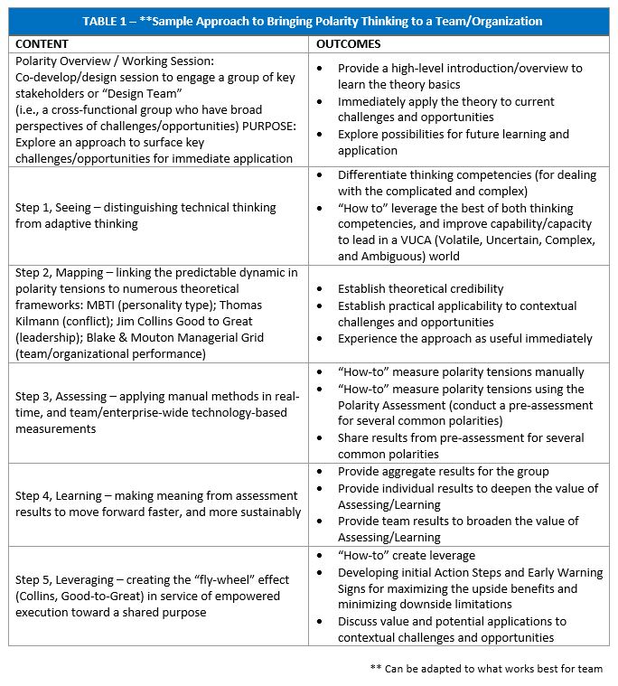 Success today and in the future requires critical distinctions be made in the type of thinking that’s needed for challenges and opportunities. One type of thinking addresses complicated and solvable technical problems using “either/or.” Another type of thinking addresses complexity for technically unsolvable adaptive “polarity” challenges using “both/and.”