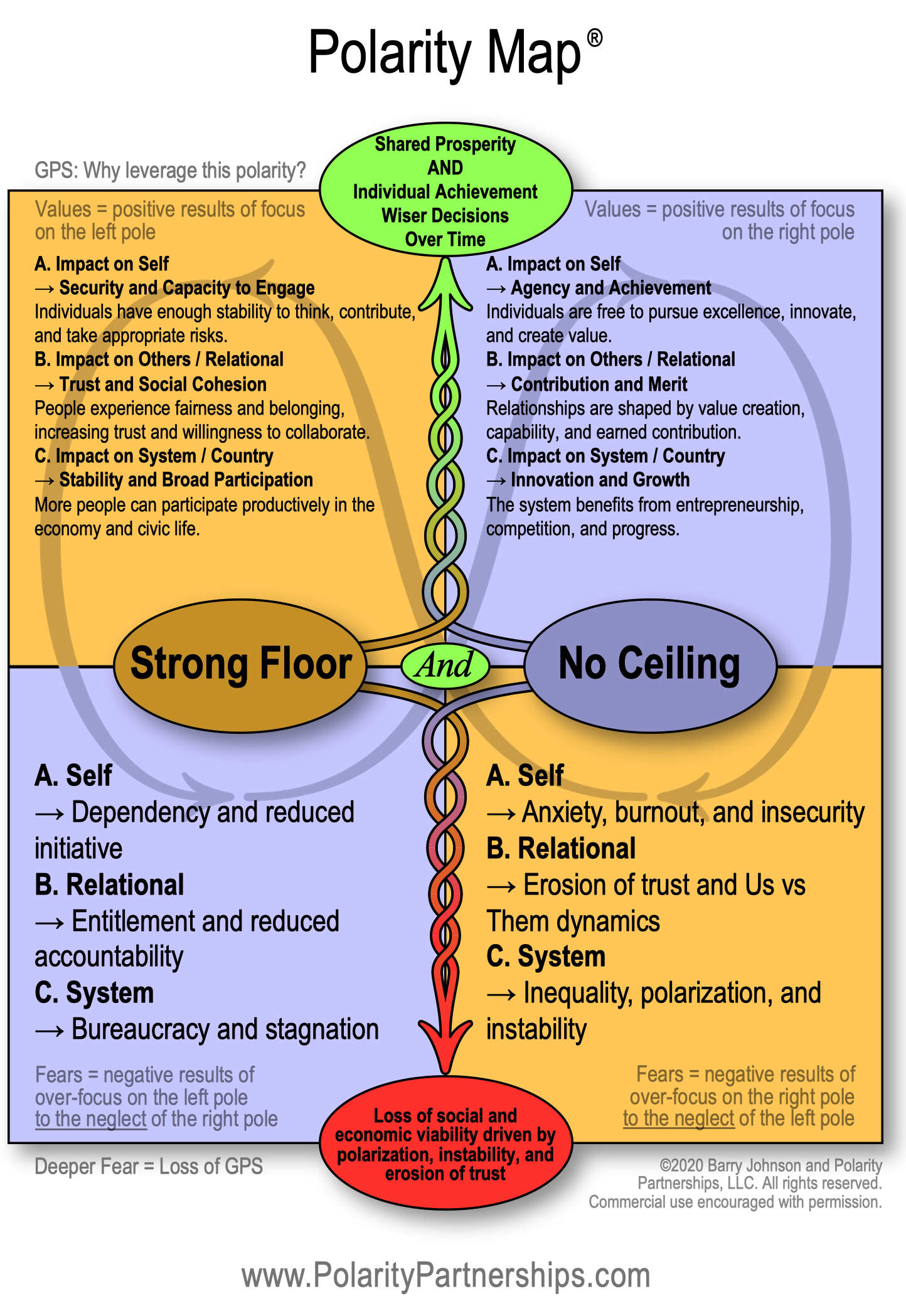 Mapping makes that interdependence visible. Strong Floor AND No Ceiling can be described in language, but it becomes more actionable when we can see what we are trying to gain from each side and what happens when either side is overemphasized. A strong floor without attention to opportunity drifts toward stagnation and dependency. No ceiling without a strong floor drifts toward instability and widening gaps. Neither outcome is the intent. Both are predictable when the poles are separated. Mapping clarifies that the goal is not to pick one. It is to strengthen both in service of a shared purpose.