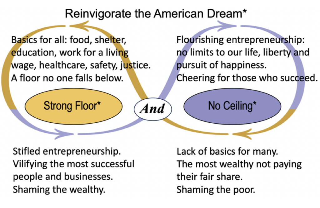 Strong Floor AND No Ceiling is a simple idea. It is clear. It is compelling. It resonates across differences in a way that most policy ideas do not. It offers a path that does not force a choice between stability and opportunity, between dignity and contribution, between fairness and growth. It reframes “Reinvigorating the American Dream” as something that depends on holding both over time.