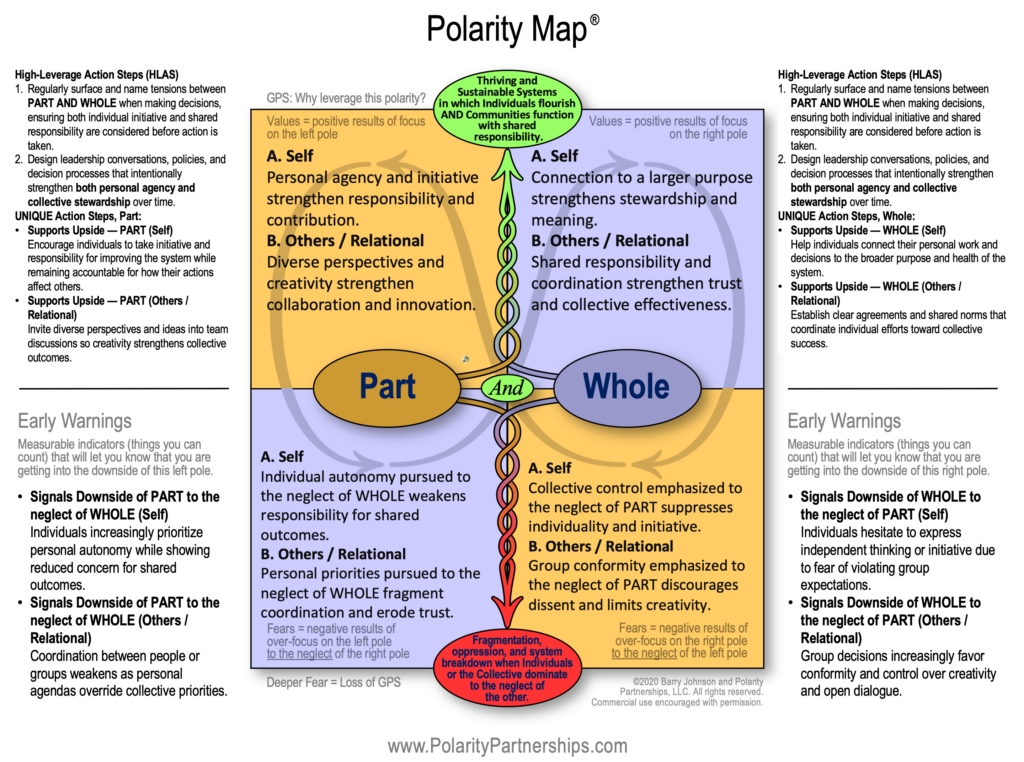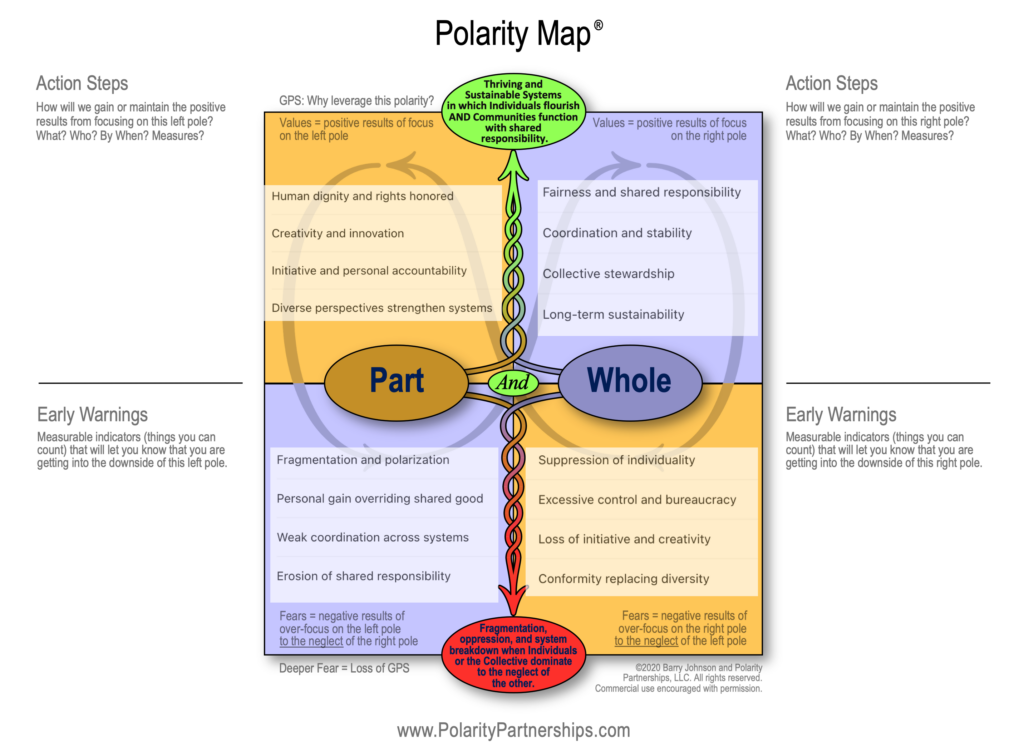 Barry Johnson describes this same pattern through the Part AND Whole polarity that runs through individuals, families, teams, organizations, and nations alike (See Chapters 4-11 in SECTION 2 of And, Volume 1). Freedom, uniqueness, and initiative give life to the parts. Equality, connectedness, and coordination give life to the whole. Both are required for a system to thrive.