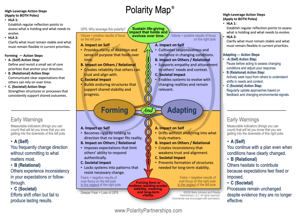 The infinity loop in a Polarity Map isn’t a visual preference or design flourish—it’s a structural representation of reality. Polarities are not problems to solve; they are interdependent pairs that exist in ongoing relationship. Each pole contains value that can only be sustained over time through its connection to the other. The infinity loop makes this visible. It shows that movement between poles is continuous, not linear, and that outcomes are shaped by how energy flows over time, not by choosing one side.