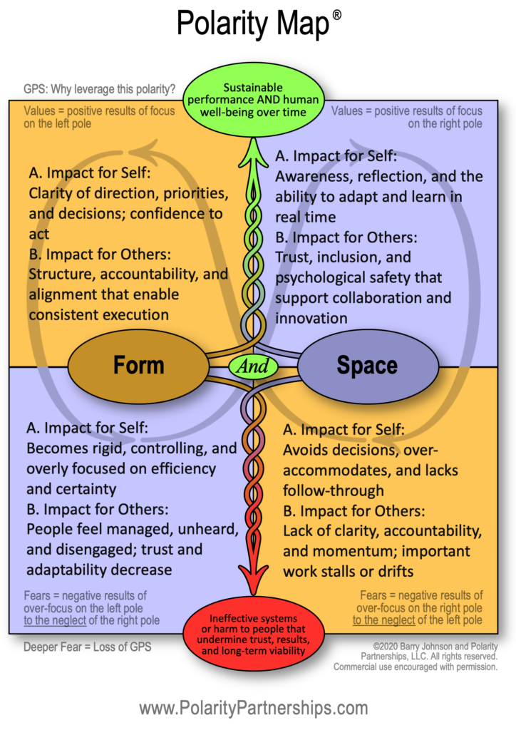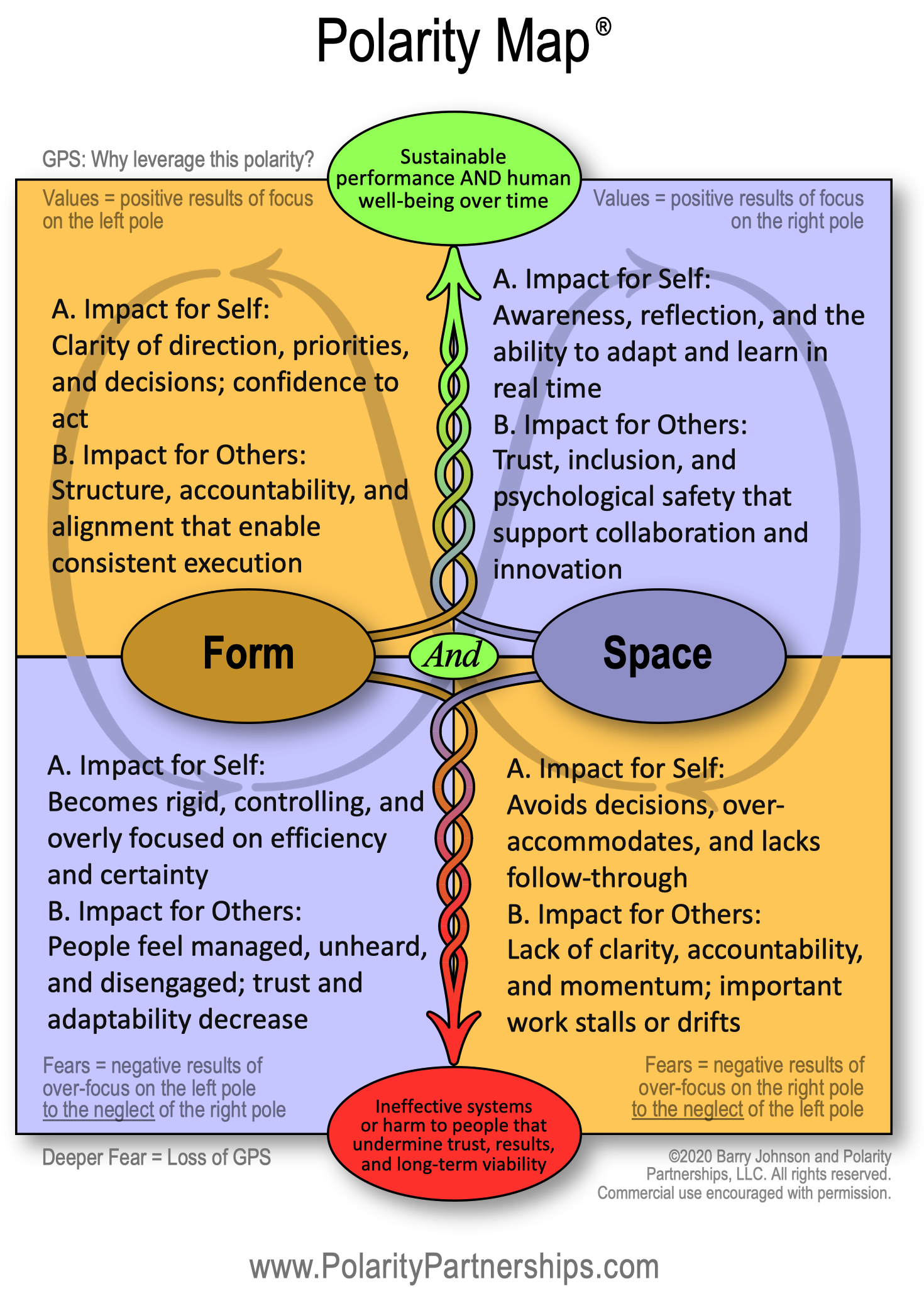 Here’s a polarity map that makes the dynamic visible—not to solve it (you cannot solve a polarity), but to navigate it more consciously: