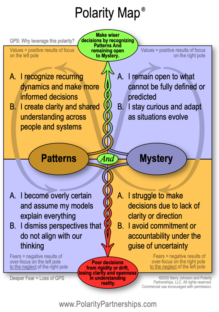 Leaders who over-rely on Pattern risk optimizing systems toward outcomes no one actually chose, while leaders who resist Pattern in the name of Mystery risk avoiding clarity where clarity is available. The work isn’t choosing. It’s developing the capacity to operate with both—grounded enough to make a call, open enough to adjust as conditions evolve, structured enough to act, and humble enough to recognize when structure becomes obstruction.