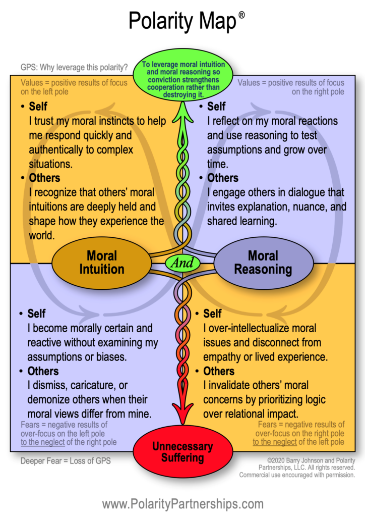 The implicit polarity at play he’s pointing to is something like Moral Intuition AND Moral Reasoning – see the Polarity MapÒ at the end of this note. The Intuition part gives us speed, meaning, and moral energy. The Reason part gives us reflection, humility, and the ability to learn. When Intuition runs amok without Reason, we get outrage, certainty, and moral overreach. When Reason runs amok without Intuition, we get detachment, technocratic tone-deafness, and moral anemia. I know both states well. Most of us do. The exhaustion comes from living inside this oscillation without a way to work it deliberately.