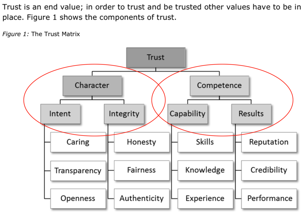 Covey talks about Character AND Competence, and the ripple effect across Self, Relationship, Organizational, Market, and Societal trust.