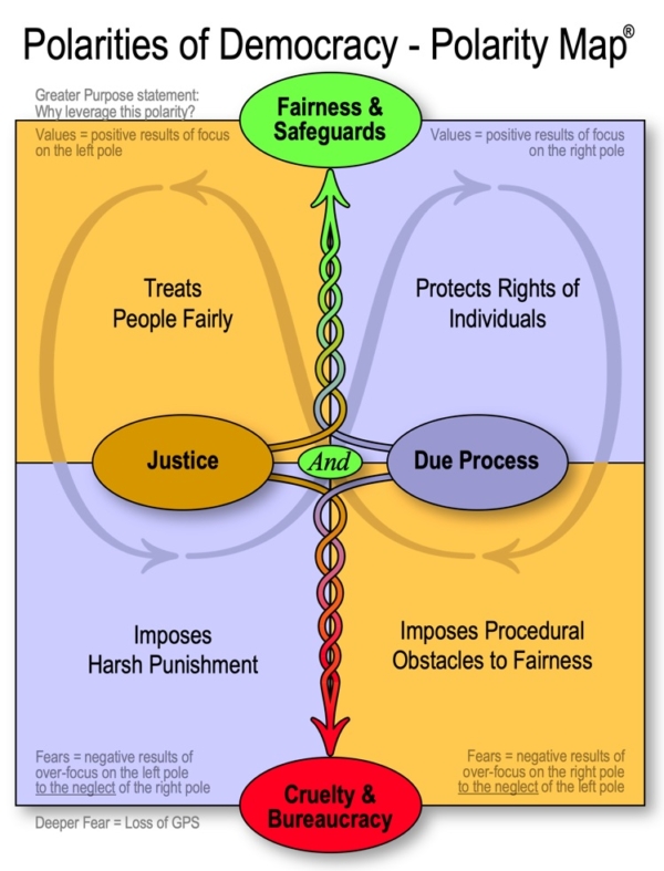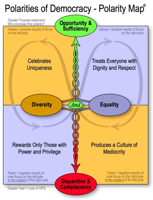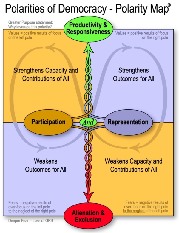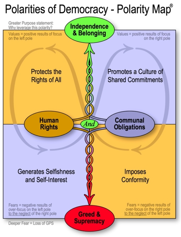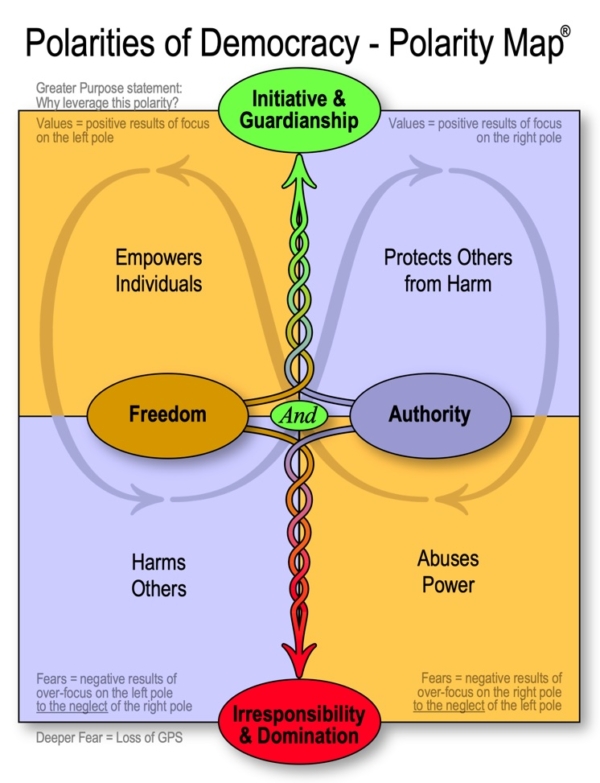 Created as a nonprofit social change think tank in 2017, the Institute for the Polarities of Democracy joins the tools and processes of decades of polarity approach development with the basic principles of democracy drawn from centuries of literature about freedom and governance under one unifying Polarities of Democracy theory, which the Institute uses to catalyze social progress through leveraging the positive aspects of democratic values at all levels of society.
