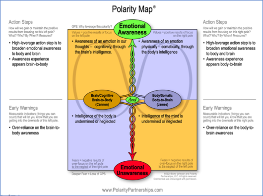 Using a Polarity Map® helps us see how both contribute to maximizing awareness in unique ways and how overemphasizing one or the other could minimize awareness. Mayo Clinic physician Elmer Green has described this effect in his biofeedback work for the treatment of disease. He says, “Every change in the physiological state is accompanied by an appropriate change in the mental-emotional state, conscious or unconscious, and conversely, every change in the mental-emotional state, conscious or unconscious, is accompanied by an appropriate change in the physiological state.”